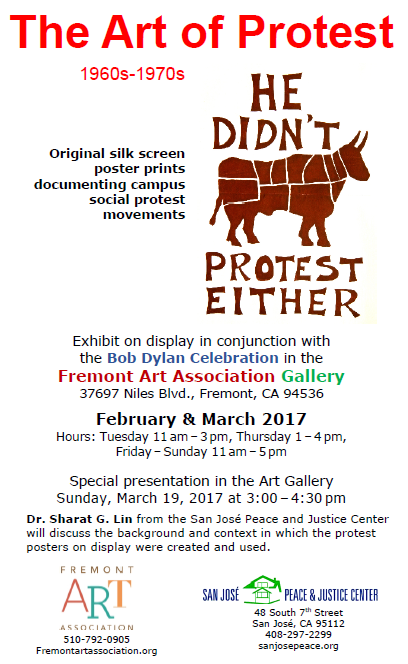 Special presentation in the Art Gallery by Dr. Sharat G. Lin from the San José Peace and Justice Center who will discuss the background and context in which the protest posters on display were created, used, and collected.
