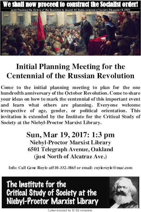 Come to the initial planning meeting to plan for the one hundredth anniversary of the October Revolution. Come to share your ideas on how to mark the centennial of this important event and learn what others are planning. Everyone welcome irrespective of age, gender, or political orientation. This invitation is extended by the Institute for the Critical Study of Society at the Niebyl-Proctor Marxist Library.