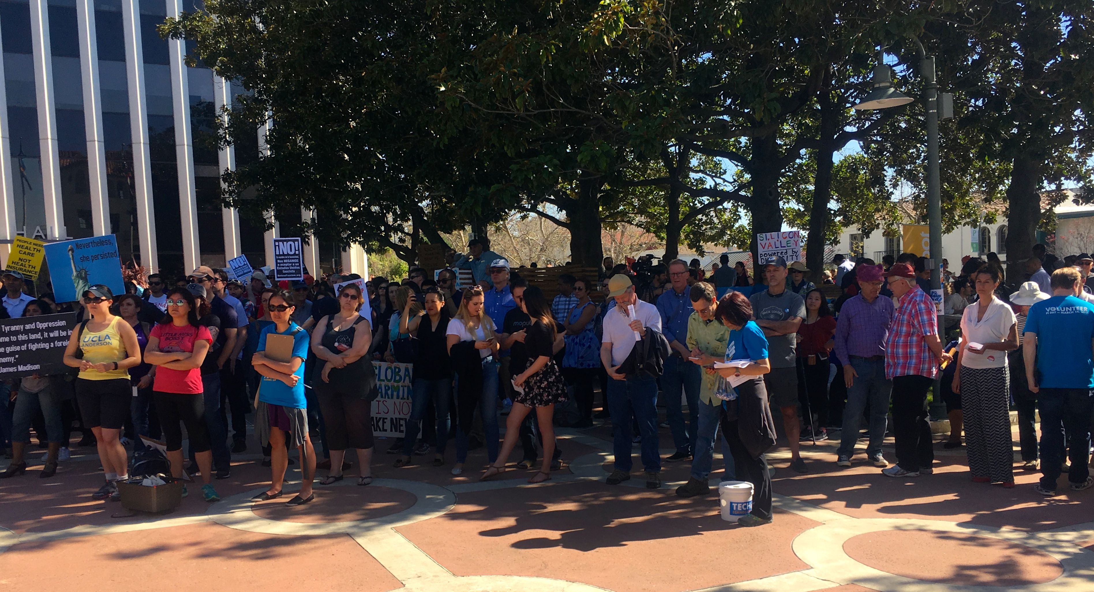 Highly paid tech workers drive up rents in the Bay Area. Many commute to Silicon Valley on luxury buses. Protests in Palo Alto against Palantir take aim at the Big Data company for providing its product to the Department of Homeland Security to identify undocumented immigrants. But today, in partnership, left wing activists and tech employees staged an alliance against White House policies.