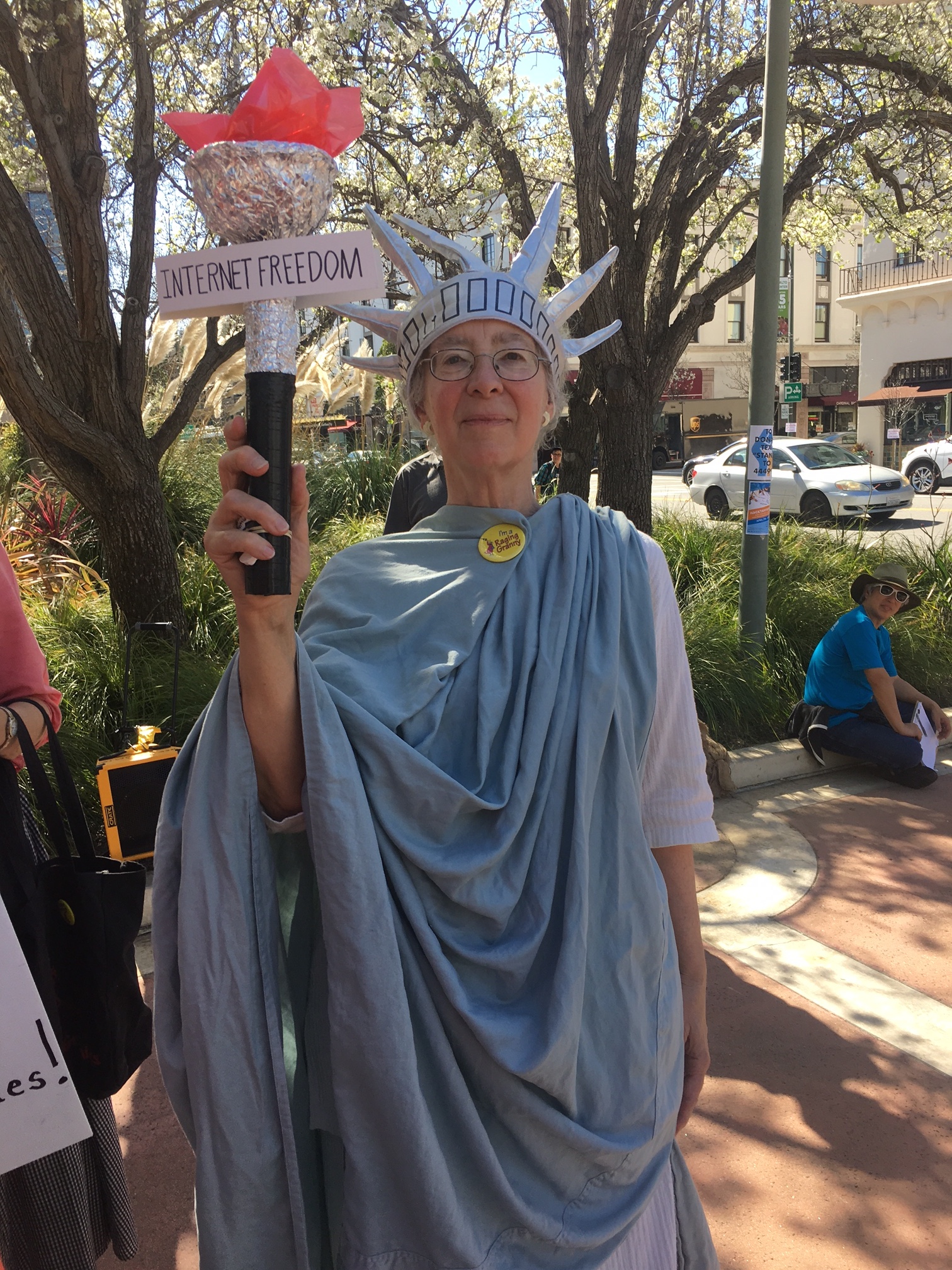 Derecka Mehrens, co-founder of Silicon Valley Rising, said tech companies must improve the lot of low-wage, largely immigrant subcontracted janitors, security officers, and cafeteria workers. Union leaders and health care activists also spoke from a stage, along with the Raging Grannies who sang out for net neutrality, internet privacy and social justice.