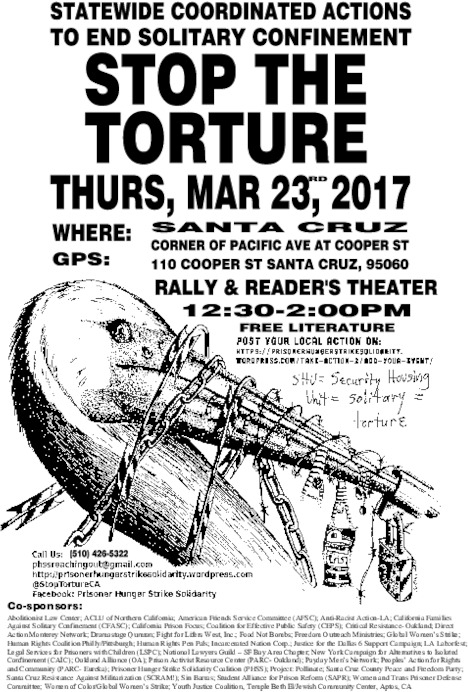End Solitary Santa Cruz, rally 12-2 pm, Thursday Mar. 23, Sunday April 23rd, and 23rd of every month (for the 23+ hours a day people in solitary are in their cells)