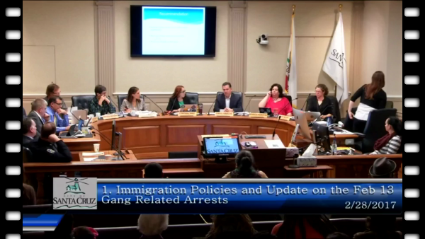 At the Santa Cruz City Council meeting on February 28, questions from members of the public, and subsequently those of Vice Mayor David Terrazas and Council Member Sandy Brown, prompted Chief of Police Kevin Vogel to admit there has been an Immigration and Customs Enforcement (ICE)/Homeland Security Investigations (HSI) agent embedded in the Santa Cruz Police Department for years, despite the fact that by law, Santa Cruz is a Sanctuary City. The questions were part of the massive public outcry following the ICE raids conducted in Santa Cruz County on February 13, in which SCPD participated. [Top video: Edited video containing Chief Vogel's admission, and the questions from the public leading up to it. Scroll down for video (two parts) of the entire Sanctuary discussion during the Santa Cruz City Council meeting on February 28.]