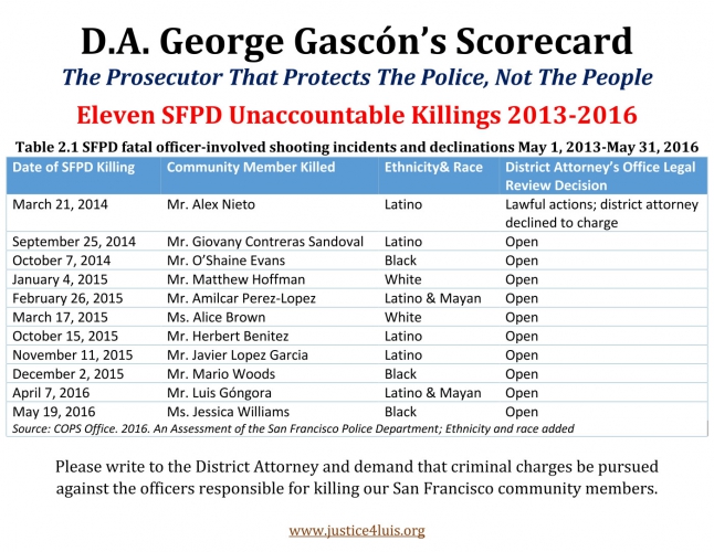 We invite supporters to call and write Gascón and demand criminal charges for the unjustifiable killing of Luis and that of many other San Franciscan community members, whose killings remain unaccountable.