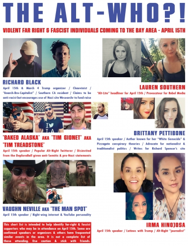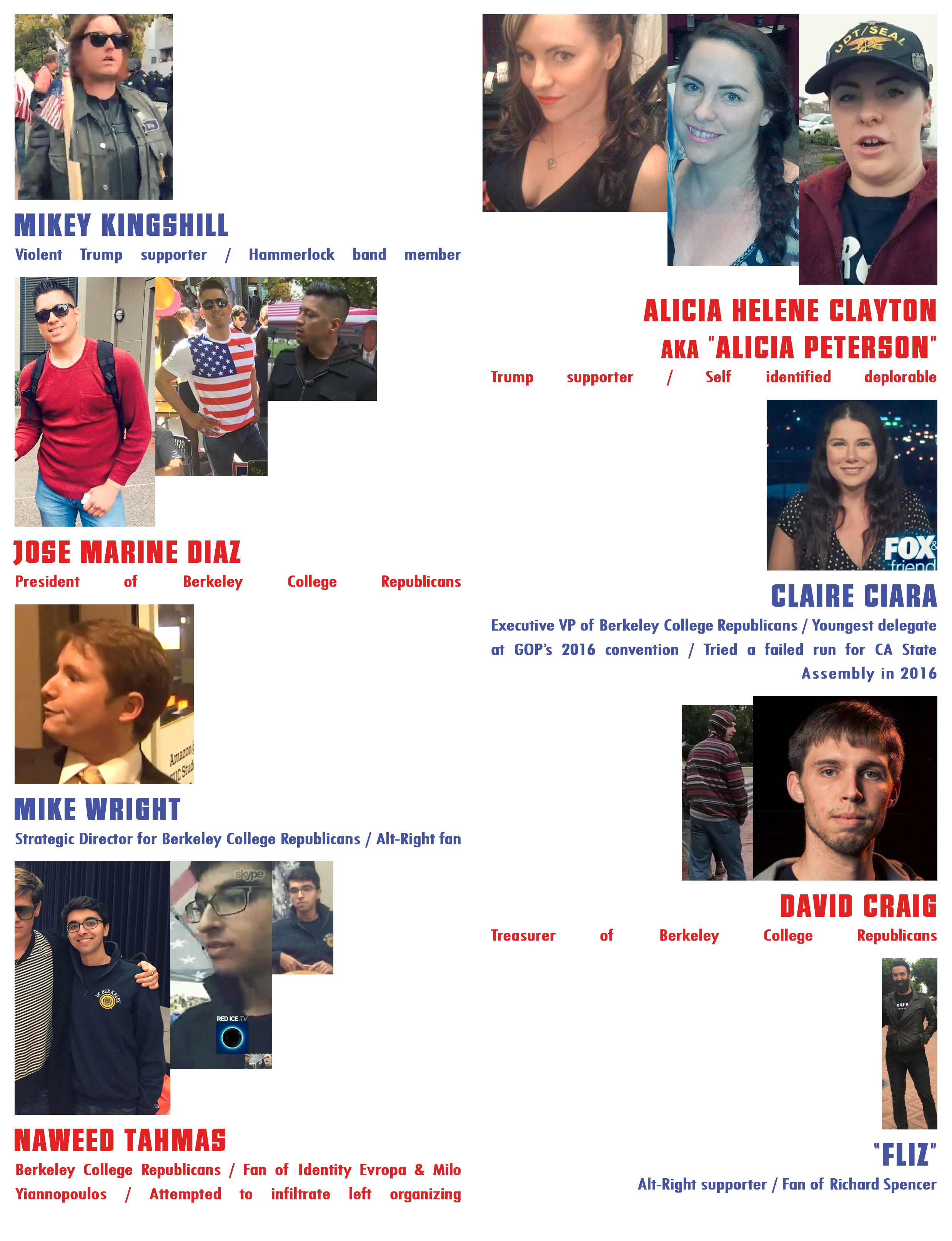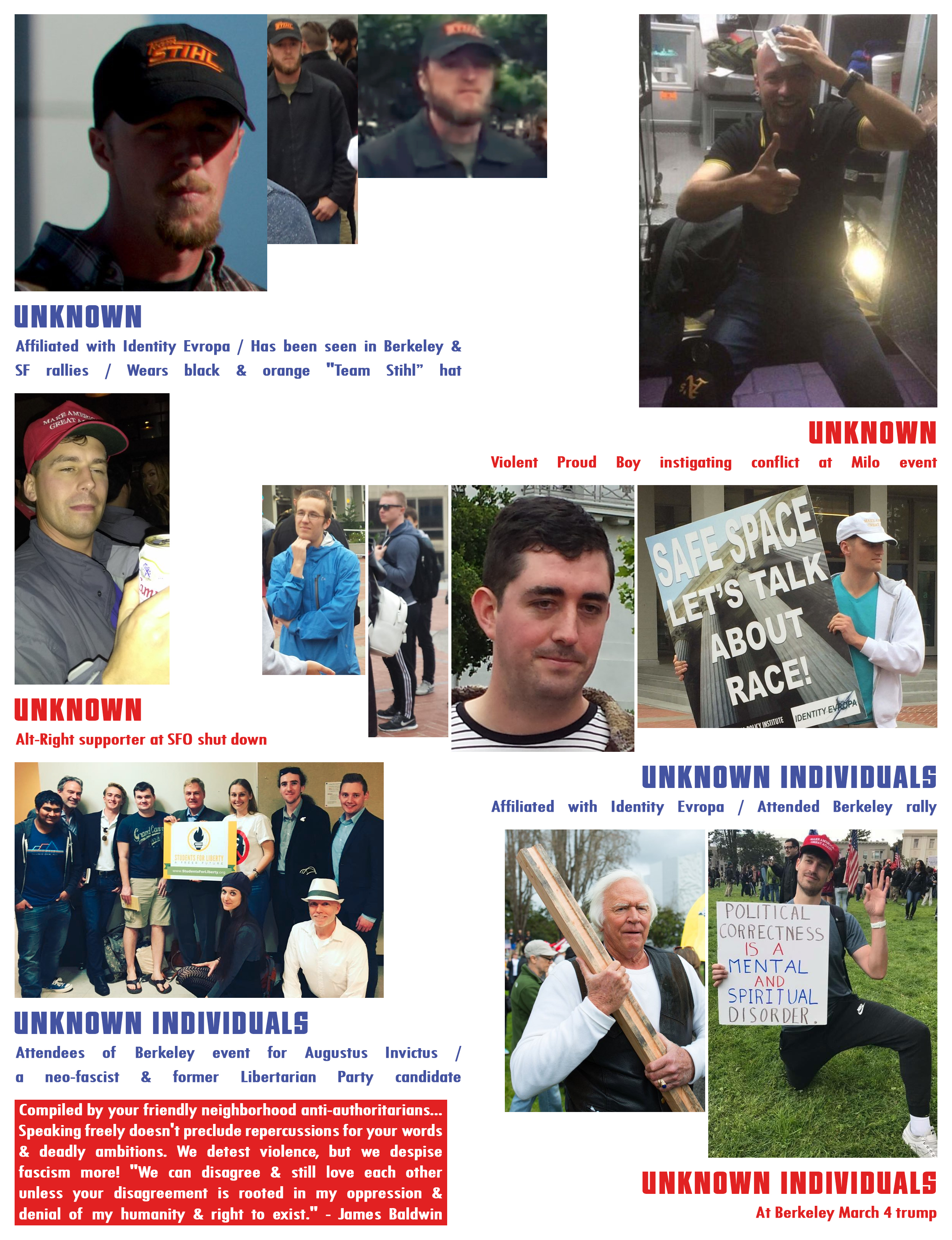 Some photo compilations, displaying information about CA based and affiliated fascist, alt-right, nationalist, and neo-nazi figures (many of whom have been involved in trying to claim space in Berkeley)