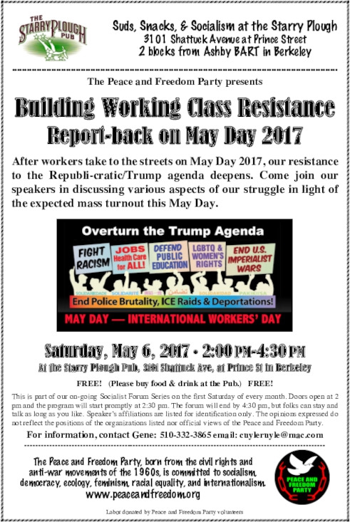 This is part of our on-going Socialist Forum Series on the first Saturday of every month. Doors open at 2 pm and the program will start promptly at 2:30 pm. The forum will end by 4:30 pm, but folks can stay and talk as long as you like. Speaker’s affiliations are listed for identification only. The opinions expressed do not reflect the positions of the organizations listed nor official views of the Peace and Freedom Party.