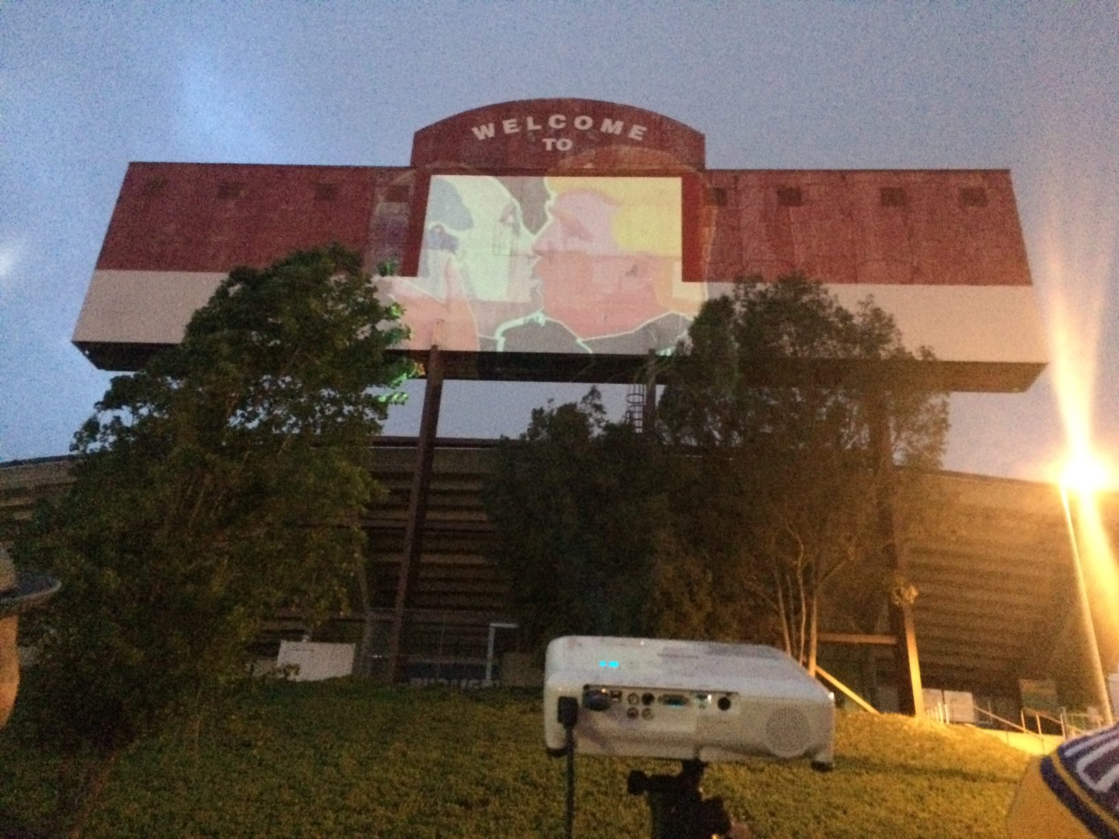 Security noticed. A policewoman asked us to leave, and we packed up. As we were on our way out, we were surrounded and seized by coliseum security. Some of us were handcuffed. Our projector tripod was broken. The coliseum security did not wear badges and refused to give their names. Once an official policeman arrived, the handcuffs were taken off, and we were released without charge.