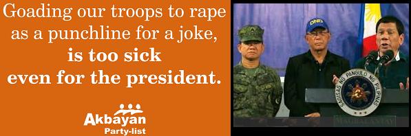 Akbayan condemns this latest horrendous remark of President Rodrigo Duterte making light of rape in front of our troops.