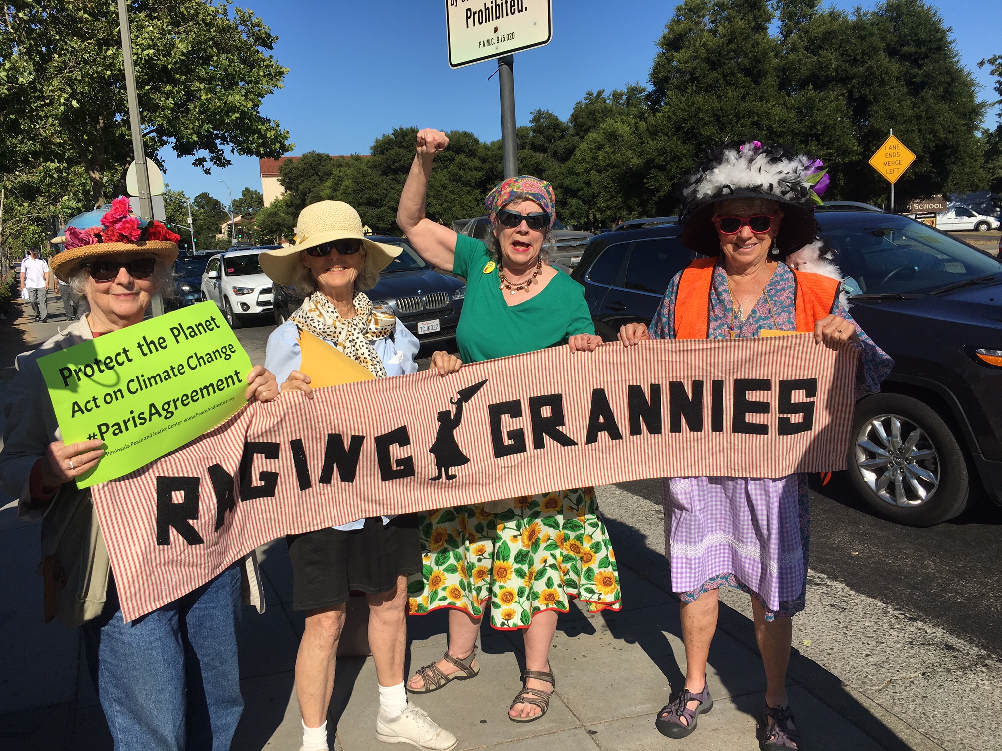 Local to the San Francisco Bay Area, the Raging Grannies raged in Palo Alto soon after hearing Trump's announcement. They led singing about Trump's mental state at a major intersection near Stanford University.