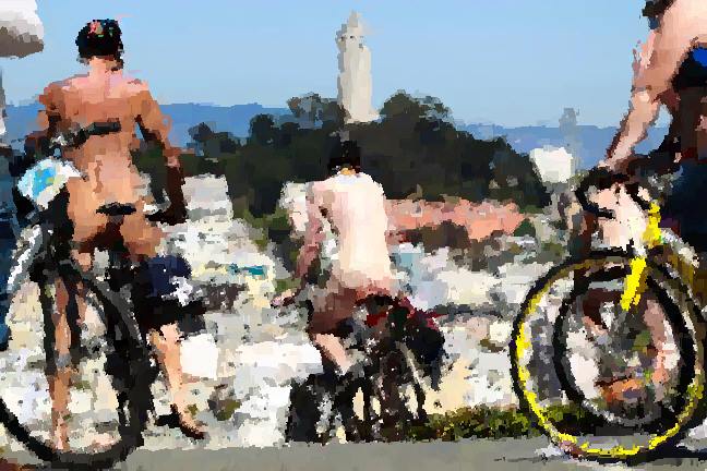 We meet near the Ferry Building on Embarcadero in an open public area to the north and between the Farmer's Market and the Starbuck's. We will begin meeting there at 11:00 AM. Please remained dressed until we have sufficient numbers of riders and are near the time we will ride.