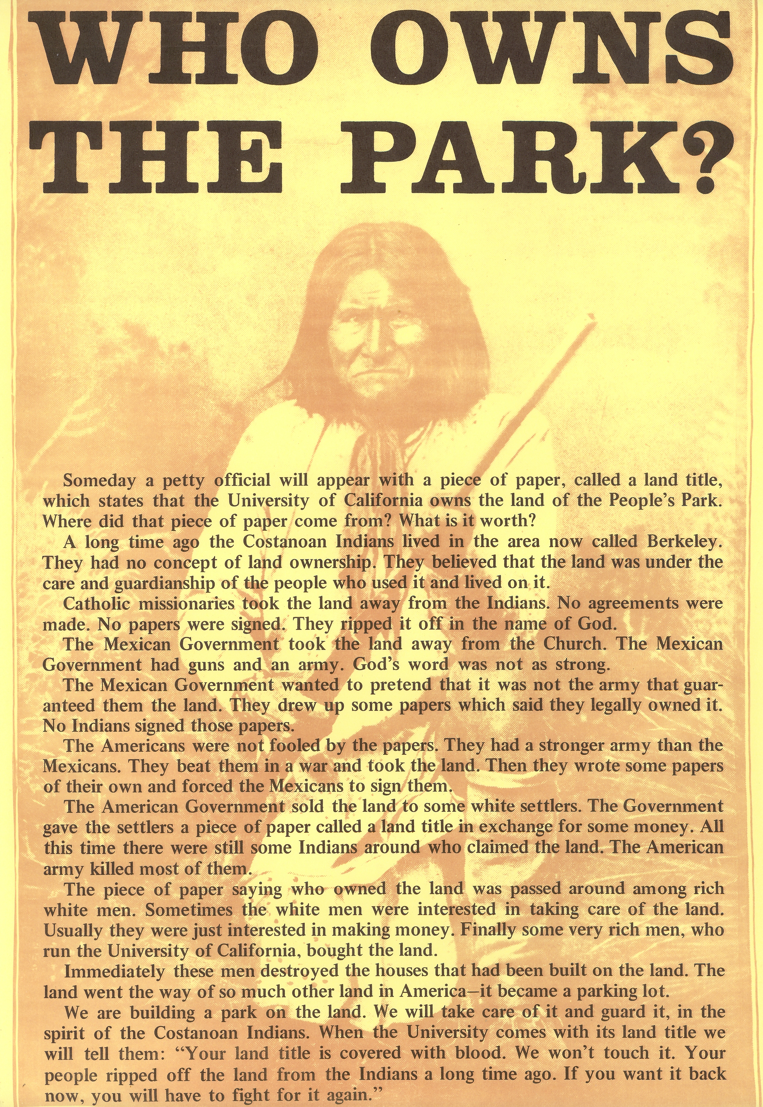 People's Park is many things. It is a green space in a very urban environment. It is a haven for those without homes. It is a symbol of community and a living monument of US history. It is not an empty lot for housing speculators to profit from. It is not a piece of land for the University and its cohorts to pretend they care about the homelessness their policies help create.
