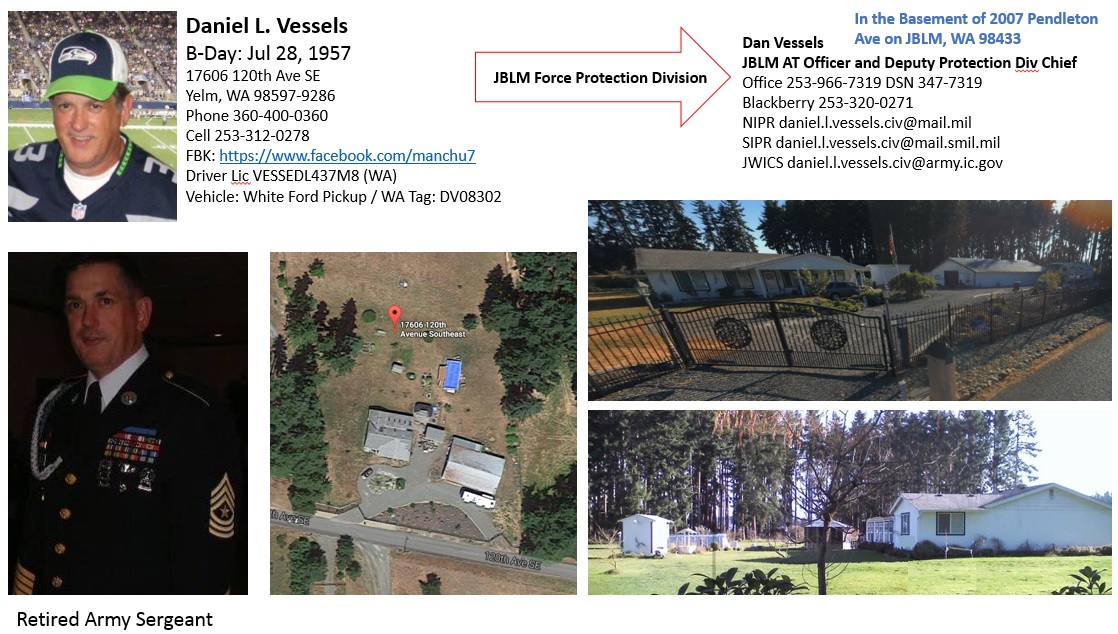Daniel L. Vessels is the deputy chief (under Thomas R. Rudd) of the JBLM Force Protection Division, the agency accused in the lawsuit (Panagacos v. Towery - https://aclu-wa.org/cases/panagacos-v-towery) of violating the civil rights of hundreds of Americans by conducting an intensive, invasive, and illegal intelligence-gathering operation against people involved in political protest in Washington and Oregon.
