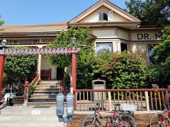 Caffé Pergolesi is situated in a Victorian-era home at 418 Cedar Street, and blurs the line between the downtown district and the historic district, seeing as that it fits both bills. The Sidewalk Companion to Santa Cruz Architecture explains that 418 Cedar Street is a one-story, raised-basement, 1886 cottage emblazoned with the legend "Dr. Miller." Originally, this sign read "Dr. Miller, Dentist." The Perg is comprised of several rooms, including a lobby, blue room, green room and orange room. The furniture is eclectic and comprises plush antique couches and church pews. A back porch is utilized by employees, while a wooden deck along Cedar Street is popular for outside seating.