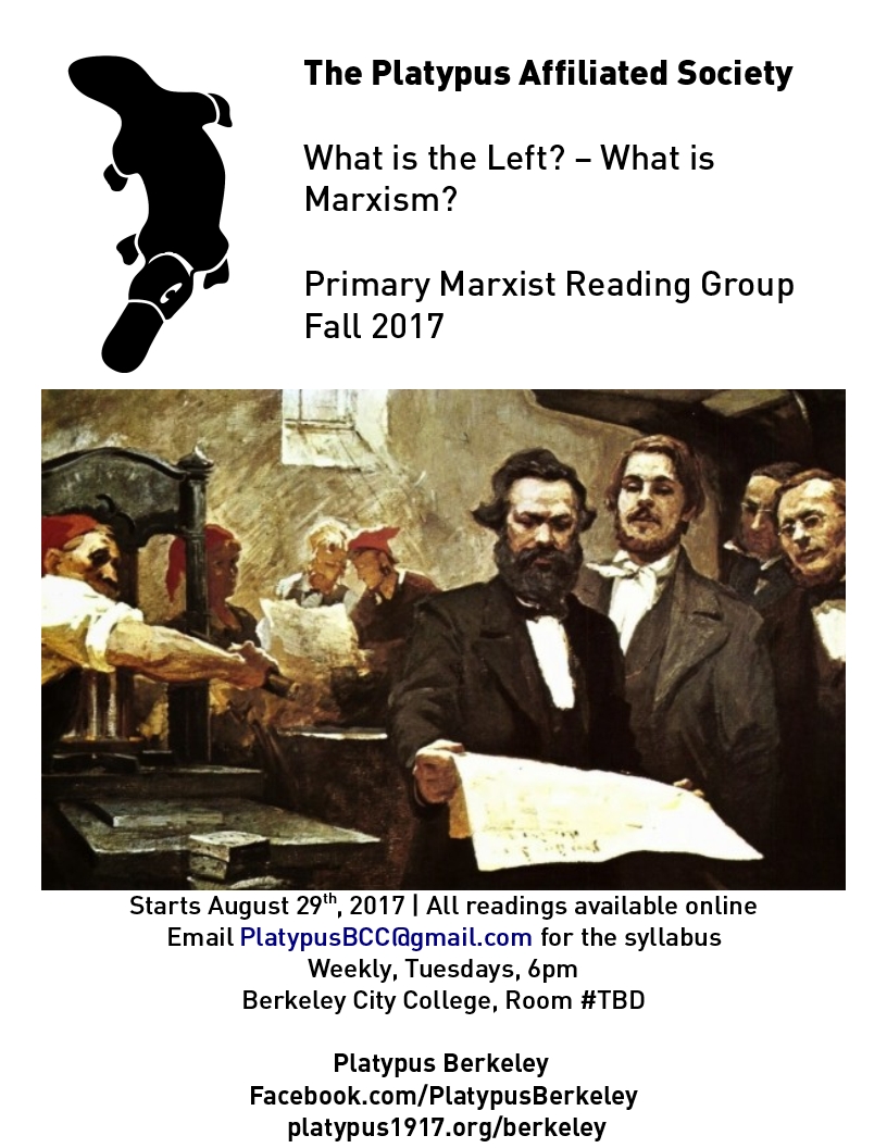 The Platypus Affiliated Society hosts a weekly informal discussion on Politics, The Left, the Platypus Review, and upcoming Leftist events & Platypus activities in the area.