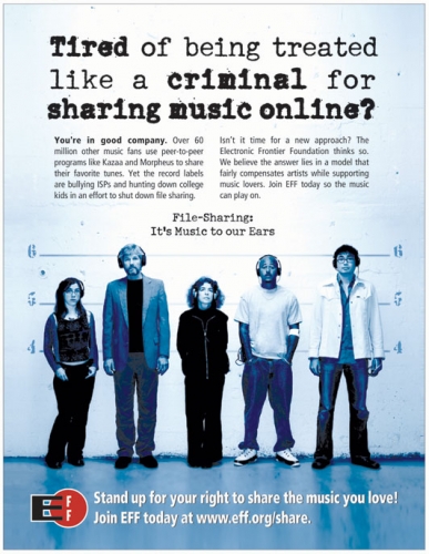 Kaye got around to many Bay Area subcultures. Here's one of her appearances in the digital rights subculture. This full page ad appeared in 2003 in Rolling Stone magazine, featuring Kaye in the middle of the lineup.
