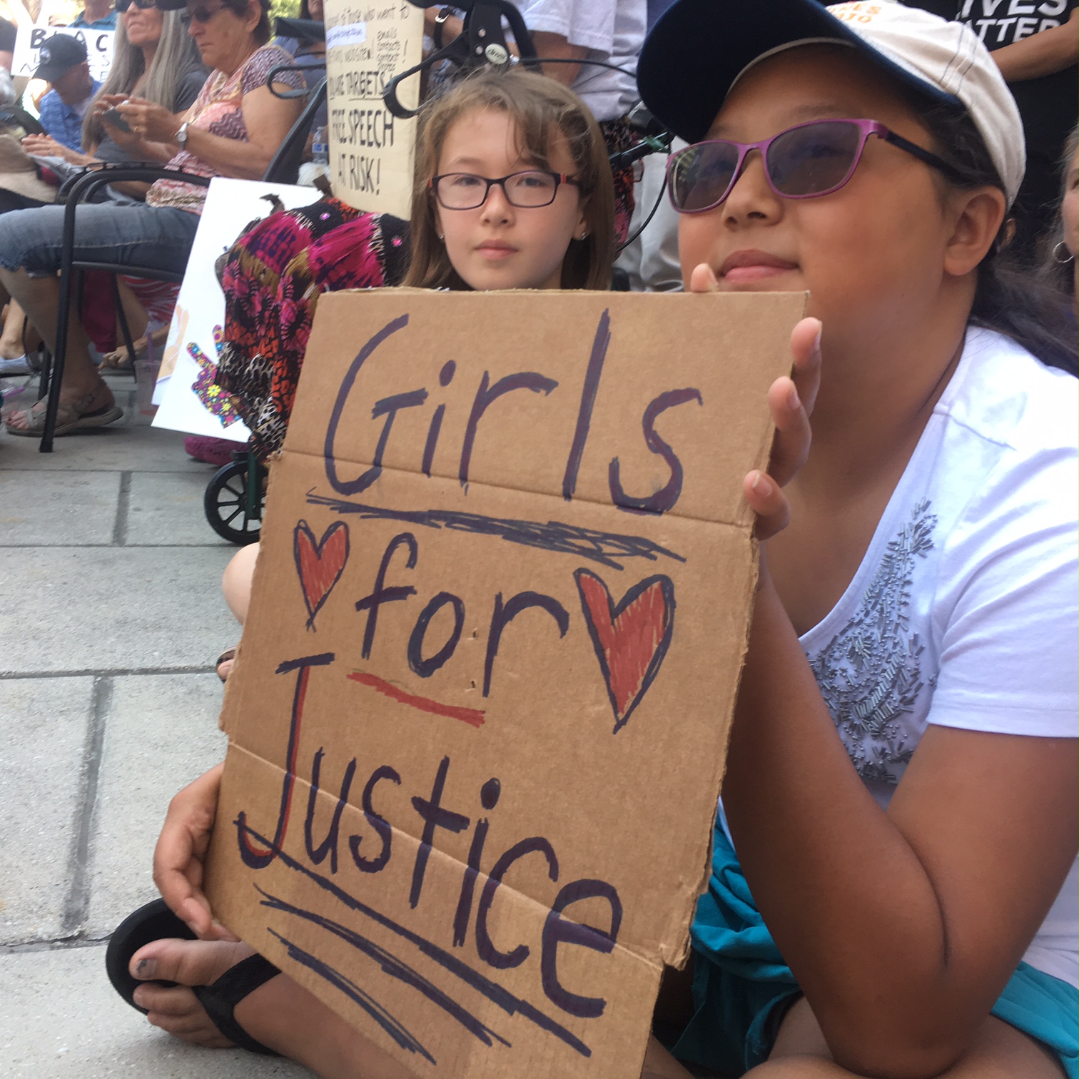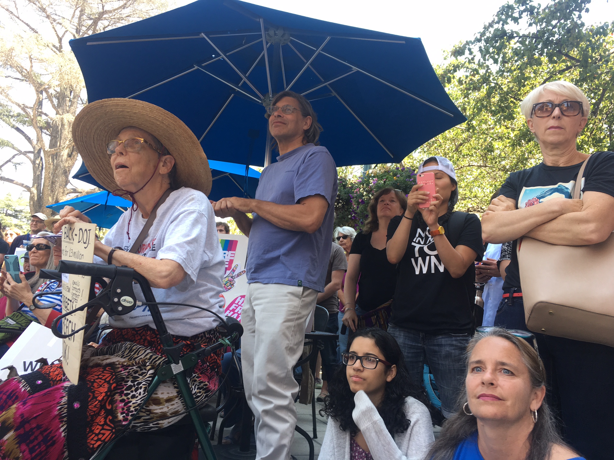 But women and men carried on with a counter protest in response to the postponed right wing event this afternoon. At the city's central plaza in downtown Mountain View, women sang a song they wrote about alt-right support for Damore at an open mic. A young woman carried a sign that read, “This is the Bay where Women in Tech Slay”. Other signs called for an end to discrimination against women employed in tech. They were taking part in the demo “Rally for Human Rights, Dignity, Equality”, which presented the opportunity for the community to demonstrate AGAINST racism and FOR equality for all.