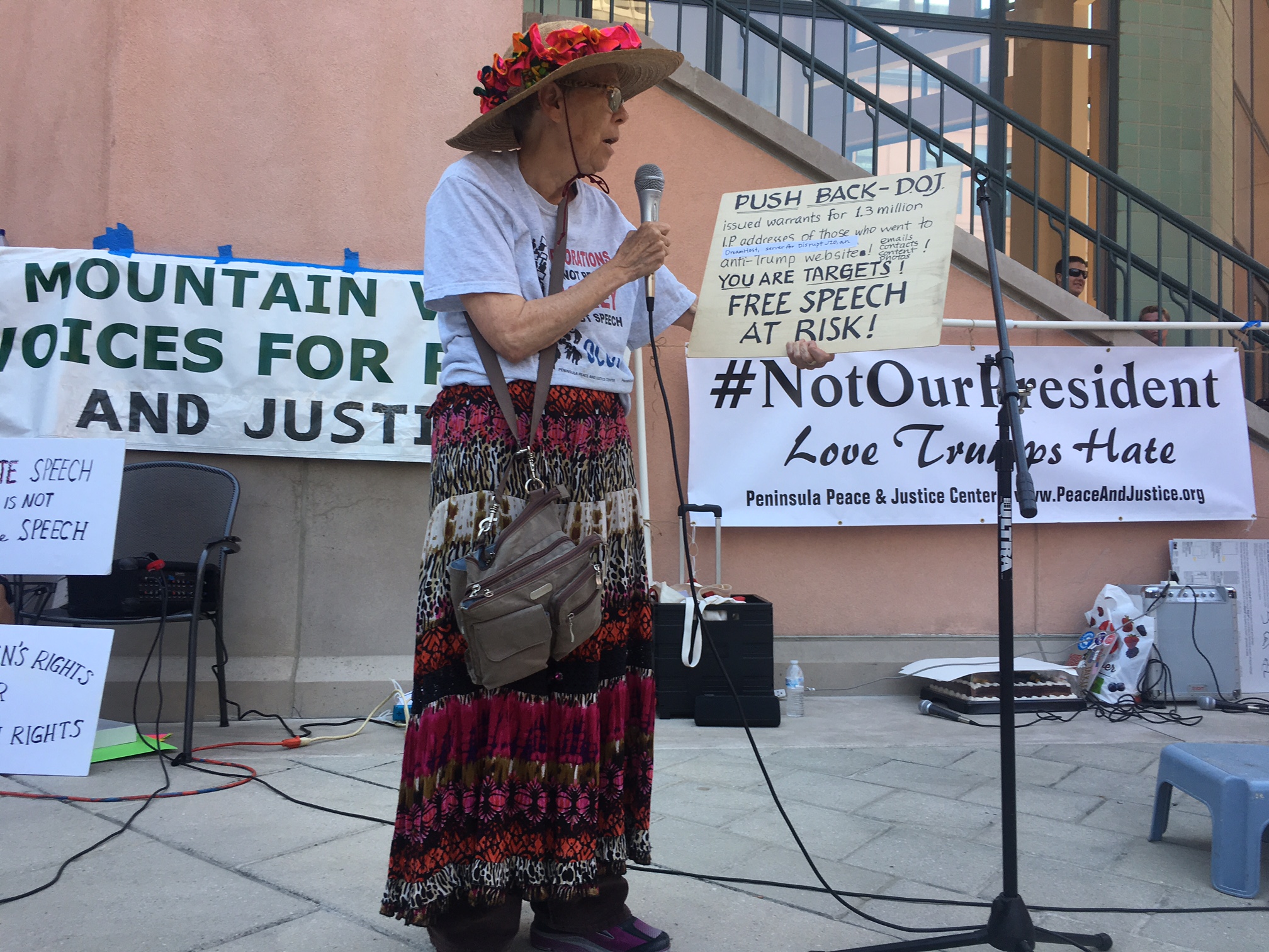 Raging Grannies member Trudy Reagan was shocked by the broad search warrant sought by the Justice Department targeting DreamHost. She called on activists to push back against the DoJ at a rally in Mountain View, CA today to the cheers of fellow activists. The rally was called to rebuke white supremacist groups that staged violent demonstrations in Charlottesville and counter a scheduled (but postponed) March on Google.