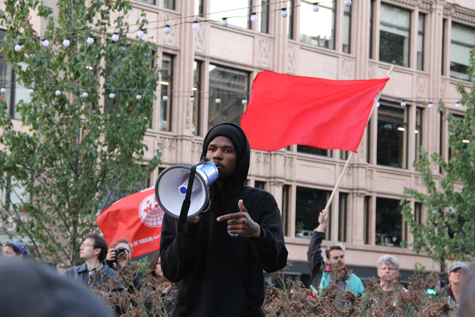 ("No Trump, No KKK, No Fascist USA" in Latham Square, video :11)