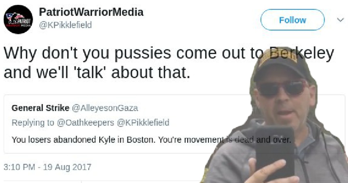 On August 27th in Berkeley, Keith Campbell AKA KPikklefield, a member of the far-Right militia the Oathkeepers and involved in Alt-Right circles, was spotted and sent packing from the failed “No Marxism in America” rally which was overwhelmingly defeated and shutdown by a massive showing from antifascists and antiracists. Campbell has since gone on social media to claim that he was attacked as a random bystander in the street while merely carrying groceries, which is a ridiculous lie considering he lives in El Cerrito and had publicly expressed his intention to participate in the rally on social media. He has a lengthy documented history of affiliation and participation with fascist politics, and over the past several months has worked to doxx and identify antifascists for targeted harassment, repression, and possible violence.