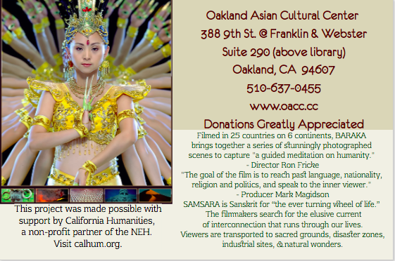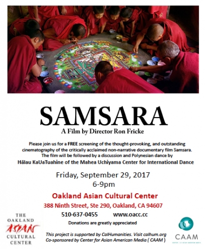 Visit the Oakland Asian Cultural Center (OACC) for a free screening of the documentary film "Samsara." The evening will also feature a brief presentation of Polynesian dance by Halau KaUaTuahine of the Mahea Uchiyama Center for International Dance in Berkeley and discussion on the film and the role of arts and culture in social change. Refreshments and a free raffle for books and Blu-ray copies of “Baraka” and “Samsara” provided. OACC's rotating exhibits (including Vietnamese Silk paintings and traditional arts and crafts through Sept. 30) also open to public noon to 6p.