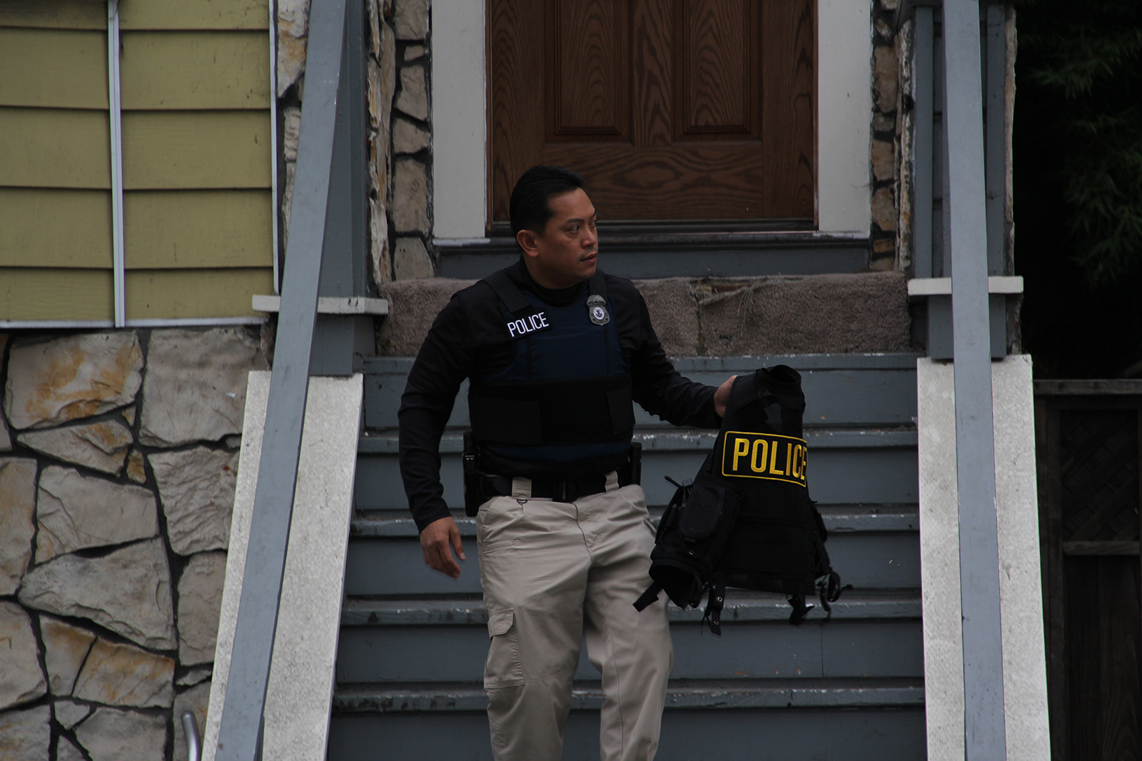 [Two armed HSI agents wearing protective gear over plain clothes enter a West Oakland home about 7:10am.]