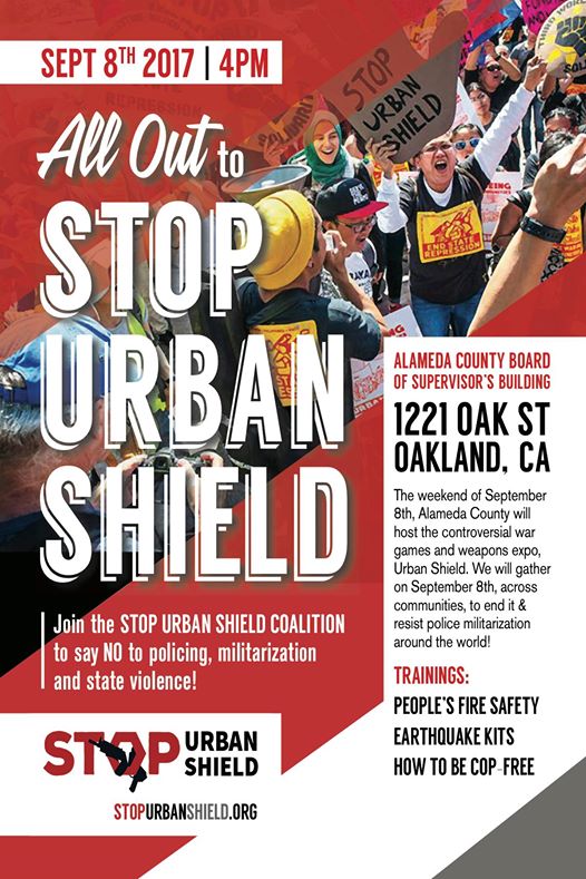 Today, hundreds of community members will join the Stop Urban Shield Coalition for a vibrant rally against the highly controversial police training and weapons expo known as Urban Shield. The militarized trainings of Urban Shield begin today, and the community rally is scheduled for the same time that the Urban Shield weapons expo will be held.