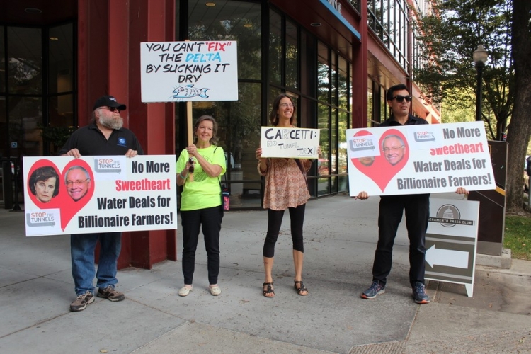 Before the Metropolitan vote, Delta residents and their allies held signs opposing the project and urging Garcetti to oppose the Delta Tunnels outside of the Sacramento Press Club event where he was speaking. They were pleased to hear that Garcetti had finally announced his opposition to the project as now conceived, although they said they are as opposed to a single tunnel as to the twin tunnels.