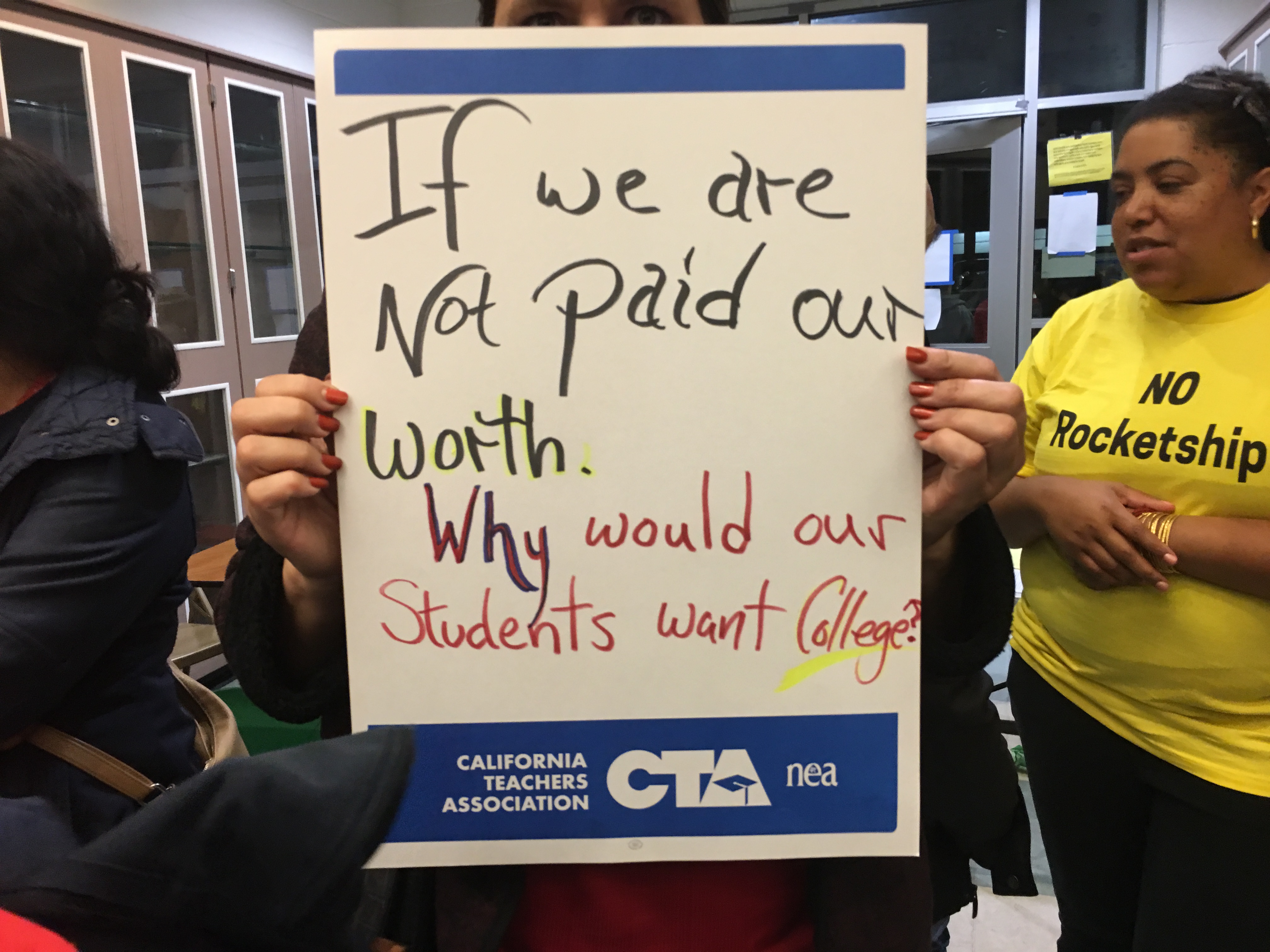 Hundreds of United Teachers of Richmond UTR members, students and parents rallied and spoke out on November 15, 2017 at a meeting of the West Contra Costa School Board meeting to call for the rejection of a Rocketship charter school and end to the privatization of education. Teachers are angry that charters are draining the district of funds and cherry pick students. They also have not had a real wage increase in years.