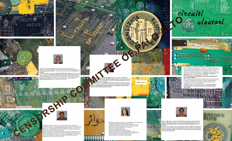 In protest of the commissioners’ intent on removing Digital DNA, the artist has created a more than 5-foot-wide collage of photos of the circuit boards with photos and biographies of the public art committee members pulled from the city website. Covered by the words “CENSORSHIP COMMITTEE OF PALO ALTO”, the collage is on display at Varella’s current art show in New York City.