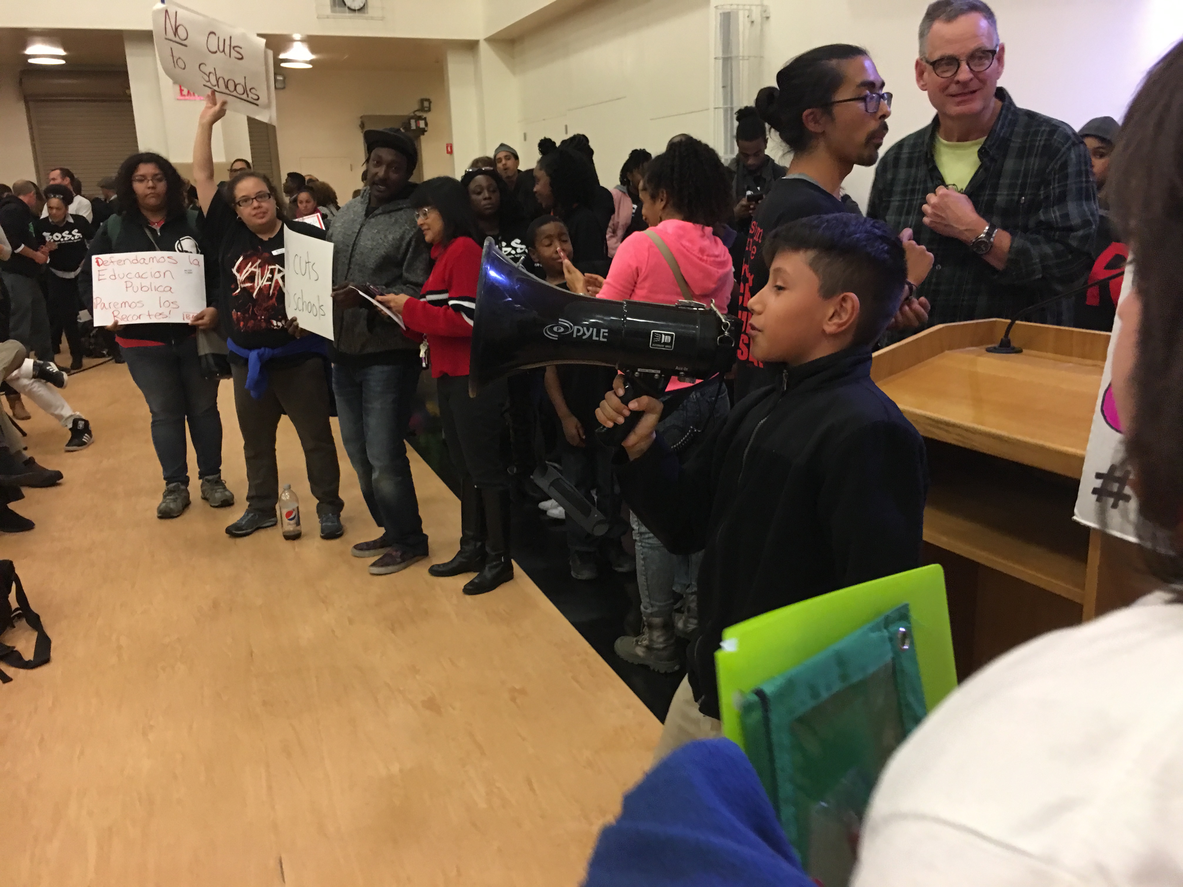 Hundreds of OEA teachers, parents and students rallied at the Oakland Unified School District board meeting on November 27, 2017 to demand that there be no cuts in the schools. Many pointed out that charters are siphoning off money to public schools and yet the school board continues to vote for them. The school previously has been pushed into bankruptcy which was used by Governor Brown to take over the schools and bring in a charter privatizer who turned over more schools to charter companies. Speakers also attacked the massive expansion of the police in the schools in Oakland pushed by the Mayor and the growing percentage of the Oakland city budget going to police.