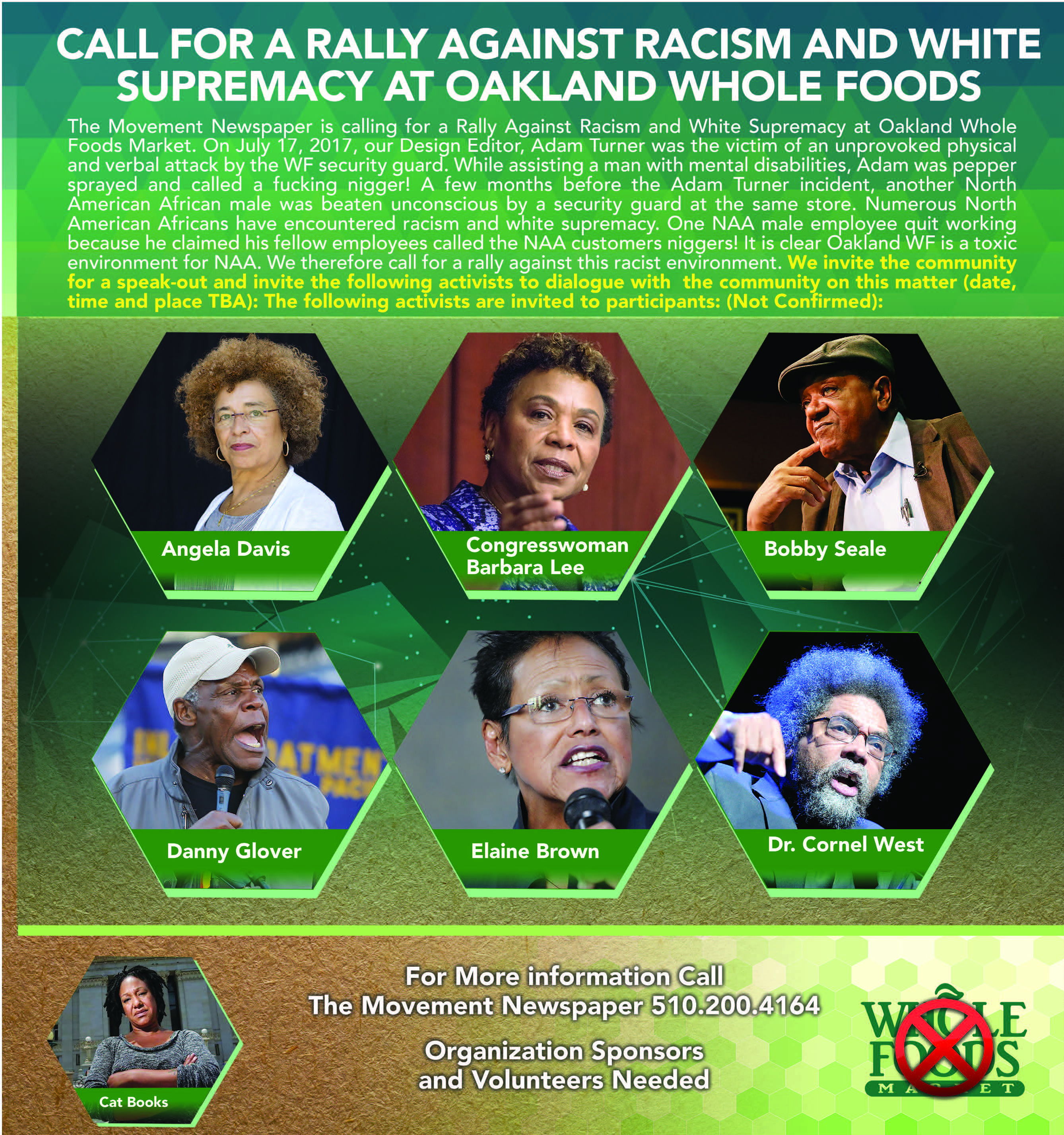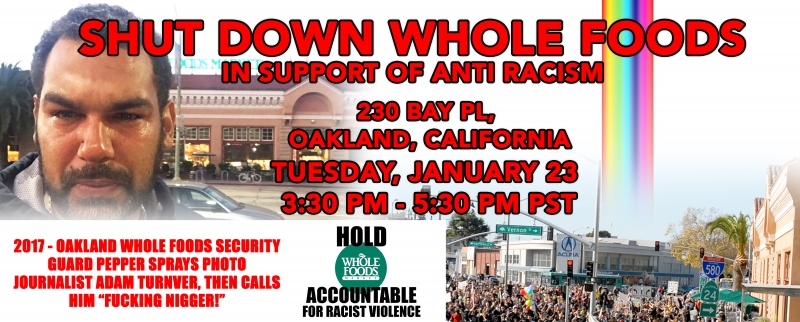 Adam Turner was the victim of an unprovoked physical and verbal attack by the Whole Foods security guard. While assisting a man with mental disabilities, Adam was pepper sprayed and called a fucking nigger! A few months before the Adam Turner incident, another North American African male was beaten unconscious by a security guard at the same store. Numerous NA Africans have encountered racism and white supremacy. One AA male employee quit working because he claimed his fellow employees called the NAA customers niggers! It is clear Oakland Whole Foods is a toxic environment for NAA. We therefore call for a rally against this racist environment. We invite the community to stand and demonstrate effectively. We will not tolerate racism in our community.