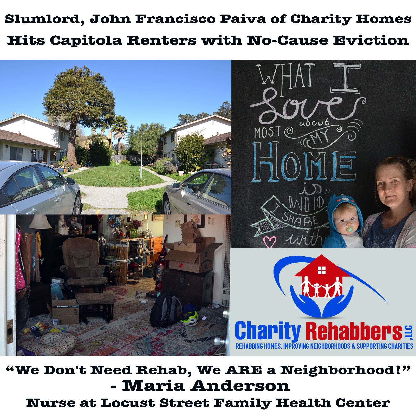 Maria is one of many tenants facing eviction from eight units in two apartment buildings at 2661 and 2651 Fresno Street in Capitola. The buildings were sold just over a week ago to a house flipper registered at 305 Vineyard Town Center #195 in Morgan Hill. The buyer – Charity Homes, LLC – is owned by John Francisco Paiva who, according to a 2014 press release from the San Jose Real Estate Investment Club, is a former executive with Cisco Systems and has acted as the full time president of Charity Rehabbers, LLC since 2013. Soon after the purchase cleared – and despite the previous owners' assurances that they would ask Paiva to be considerate of the residents' long tenancies – each apartment in the two buildings received 60 day notices to quit.