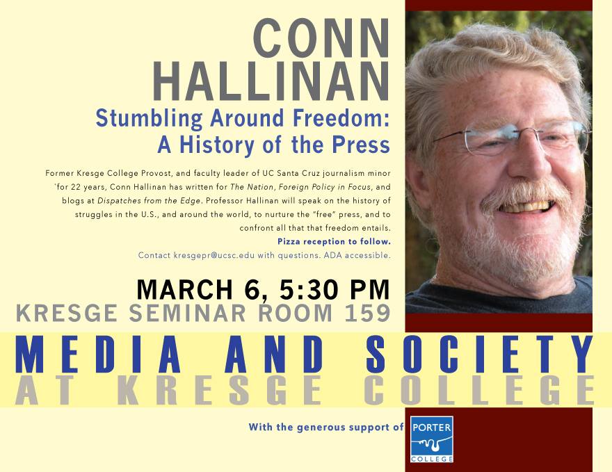 Join Kresge College's 4th Media and Society lecture this year on Tuesday, March 6th at the Kresge Seminar Room (upstairs overlooking the Piazzetta). Conn Hallinan, former Kresge Provost and faculty leader of the UCSC journalism minor for 22 years, will speak on the history of struggles in the U.S. and around the world to nurture the "free" press, and to confront all that that freedom entails. Professor Hallinan has written for The Nation, Foreign Policy in Focus, and he blogs at Dispatches from the Edge.