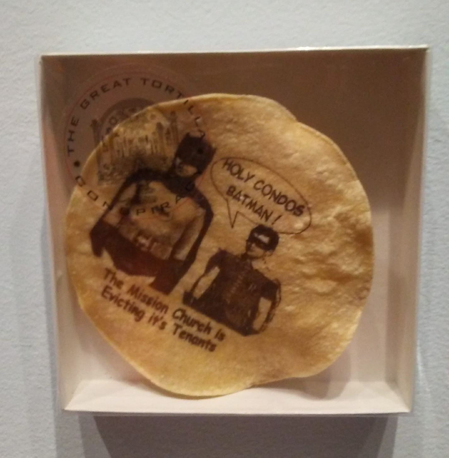 A Yañez wall of clear encased tostadas dominates one side of the room. All are tattoed with all kinds of delightfully funny and tragic imagery of sayings and caricatures of people and movements! https://tortillaconspiracy.wordpress.com/artists/