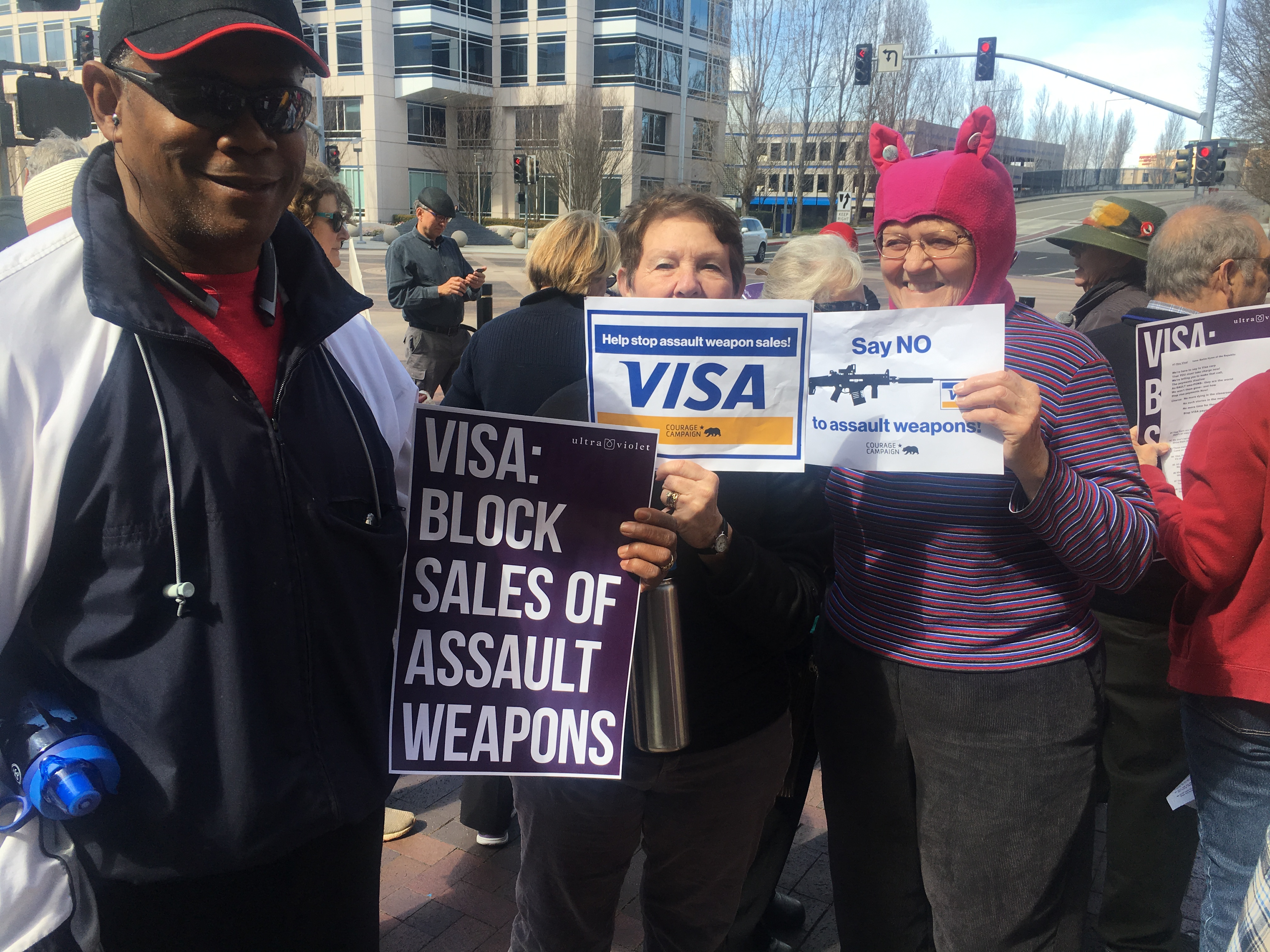 On March 8, demonstrators delivered a petition of 150,000 signatures collected with the organizing help of UltraViolet, Courage Campaign and DailyKos. Their demand of Visa: stop processing sales of assault weapons. Photos courtesy UltraViolet.