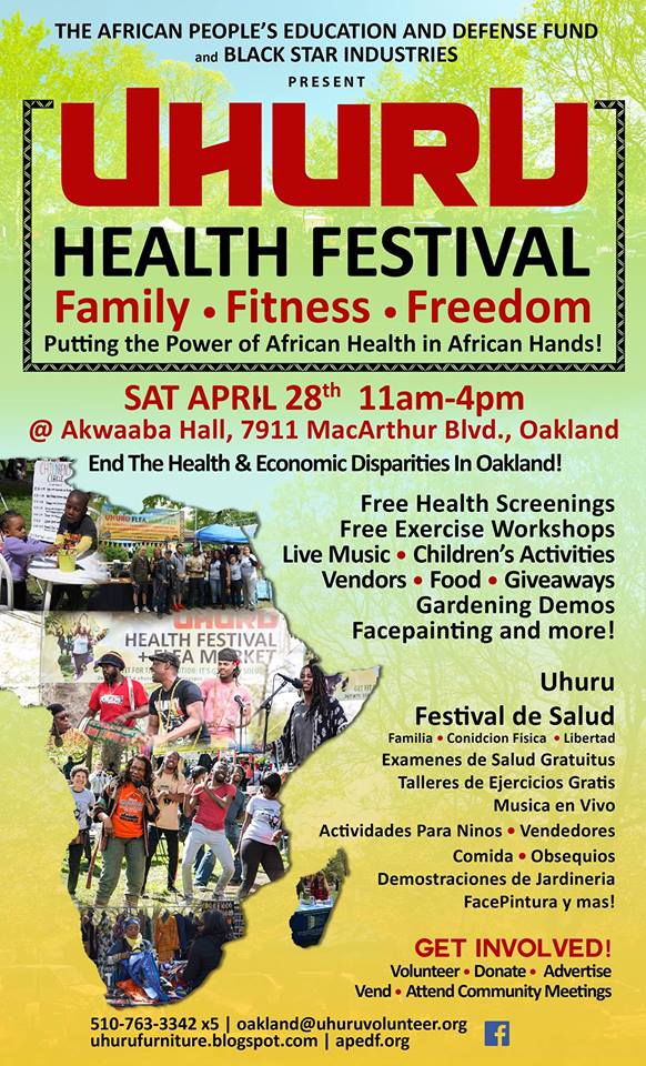 On Saturday, April 28, 2018, the African People’s Education and Defense Fund and Black Star Industries will host the Uhuru Health Festival from 11am to 4pm at Akwaaba Hall at 7911 MacArthur Blvd in Oakland.