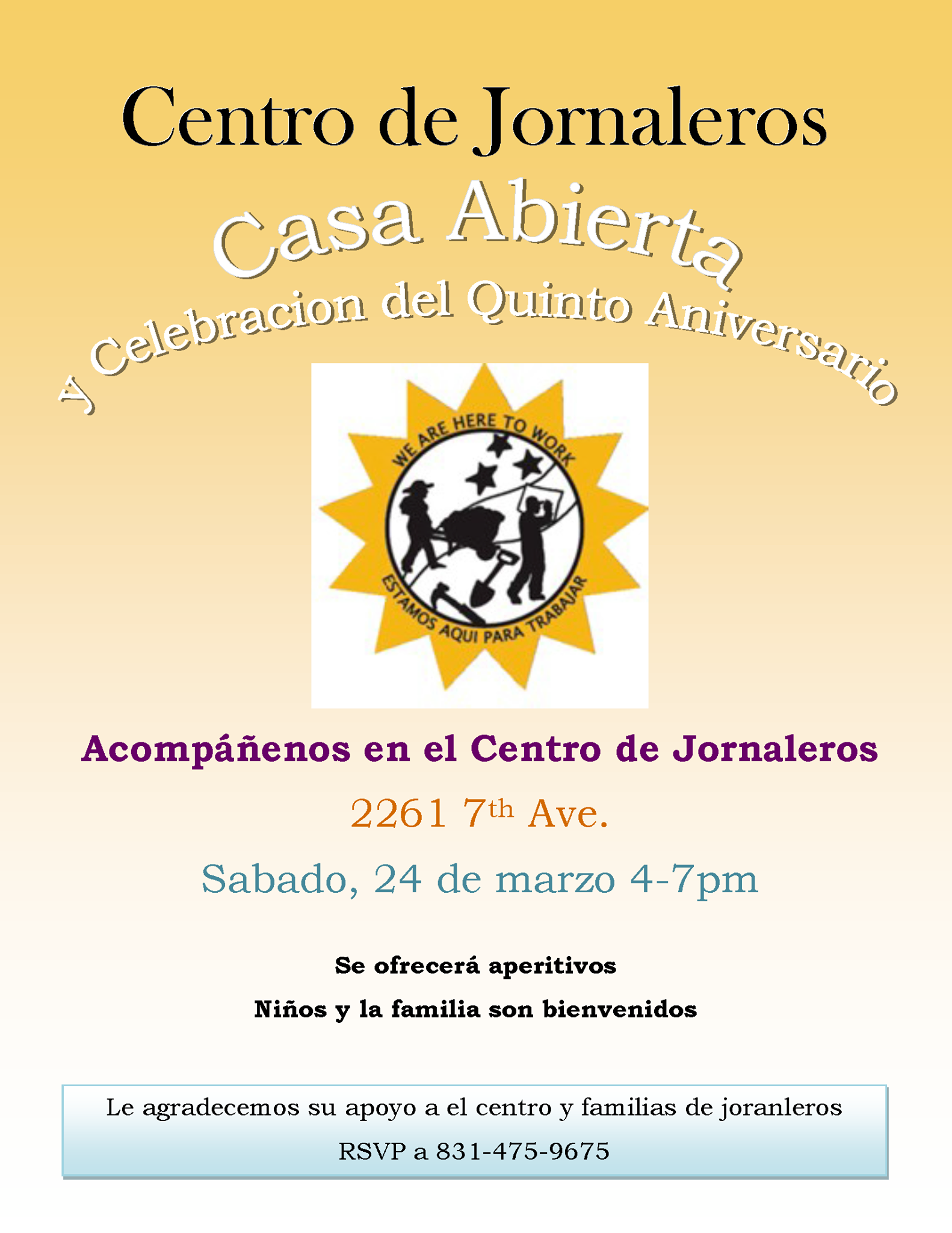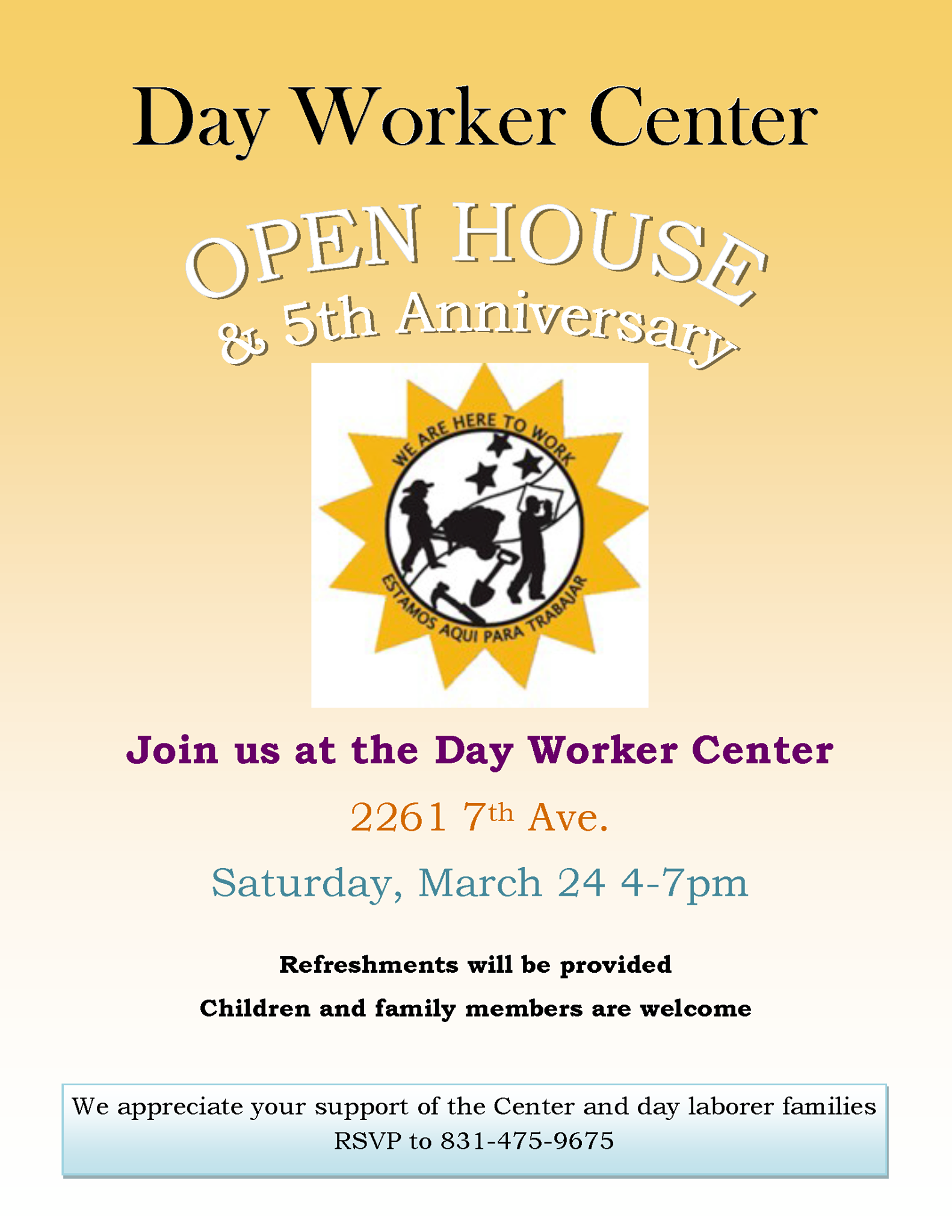 Join us for our Day Worker Center Open House and 5th Anniversary celebration! Light refreshments will be provided at the event. This is an event open to all community members--children and families are welcome!