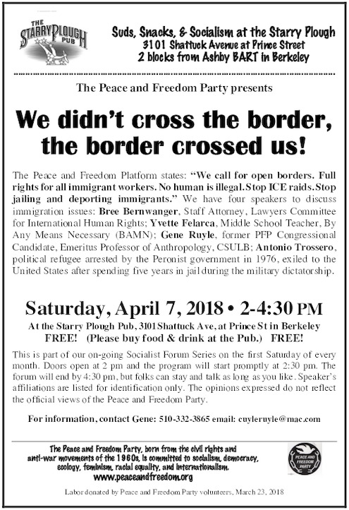 The Peace and Freedom Platform states: "We call for open borders. Full rights for all immigrant workers. No human is illegal. Stop ICE raids. Stop jailing and deporting immigrants." We have four speakers to discuss immigration issues: Bree Bernwanger, Staff Attorney, Lawyers Committee for International Human Rights; Yvette Felarca, Middle School Teacher, By Any Means Necessary (BAMN); Gene Ruyle, former PFP Congressional Candidate, Emeritus Professor of Anthropology, CSULB; Antonio Trossero, political refugee arrested by the Peronist government in 1976, exiled to the United States after spending five years in jail during the military dictatorship.
