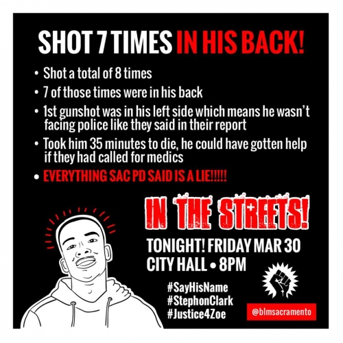 In response to the news that Clark was shot in his back, Black Lives Sacramento has organized a rally for justice for Clark this evening.