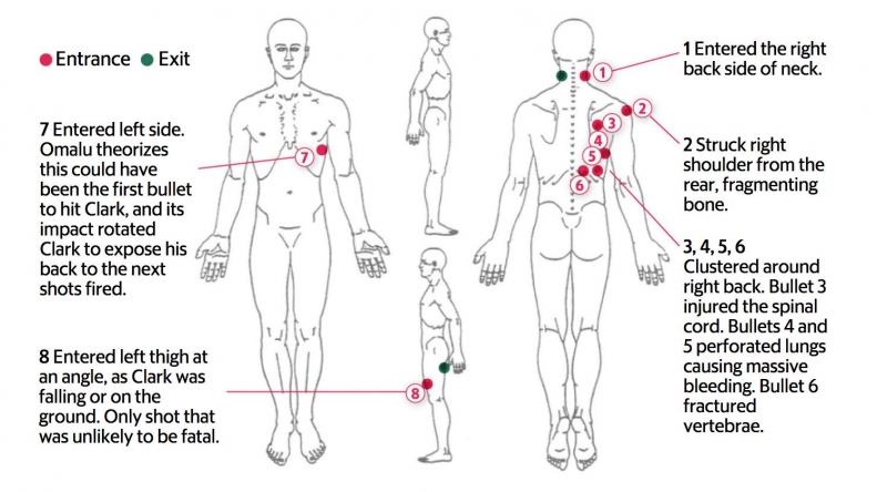 Omalu said the first of eight shots entered in the side of Clark's body, and that the trajectory of the bullet caused his body to turn so his back was to the officers. Seven more bullets entered his body. Omalu also noted that the only gunshot wound to the front of Clark's body entered through his leg and that it occurred when Clark was either falling to or on the ground.
