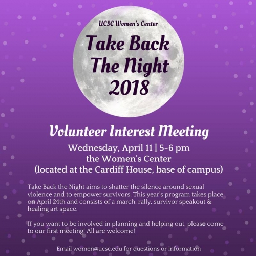 In recognition of Sexual Assault Awareness Month, the Women’s Center at UCSC is pleased to invite you to Take Back the Night 2018. The mission of Take Back the Night is to shatter the silence around sexual violence and to empower survivors.