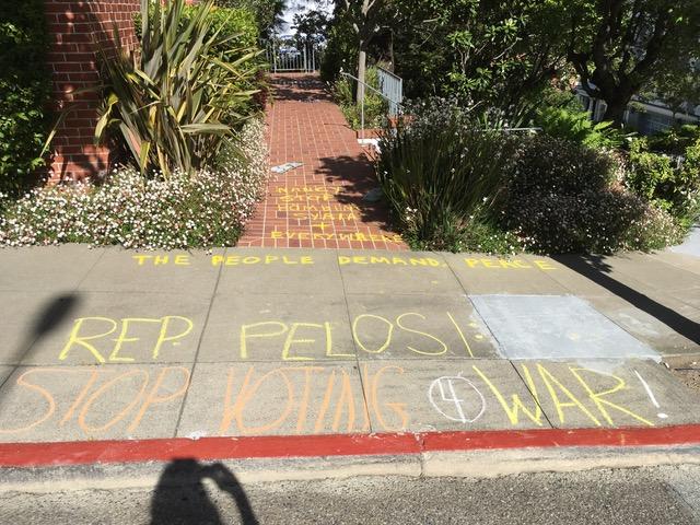 On April 14th, Members of CodePink Women for Peace chalked the driveways and posted banners at politicians' homes in the Pacific Heights district of San Francisco. Their demonstration began in front of Senator Dianne Feinstein's house, then the group marched down Broadway to the home of Nancy Pelosi. Anti-war protests held over the weekend following US bombing of Syria on April 13th were held in San Francisco at Market and Powell and in Oakland at Oscar Grant Plaza.