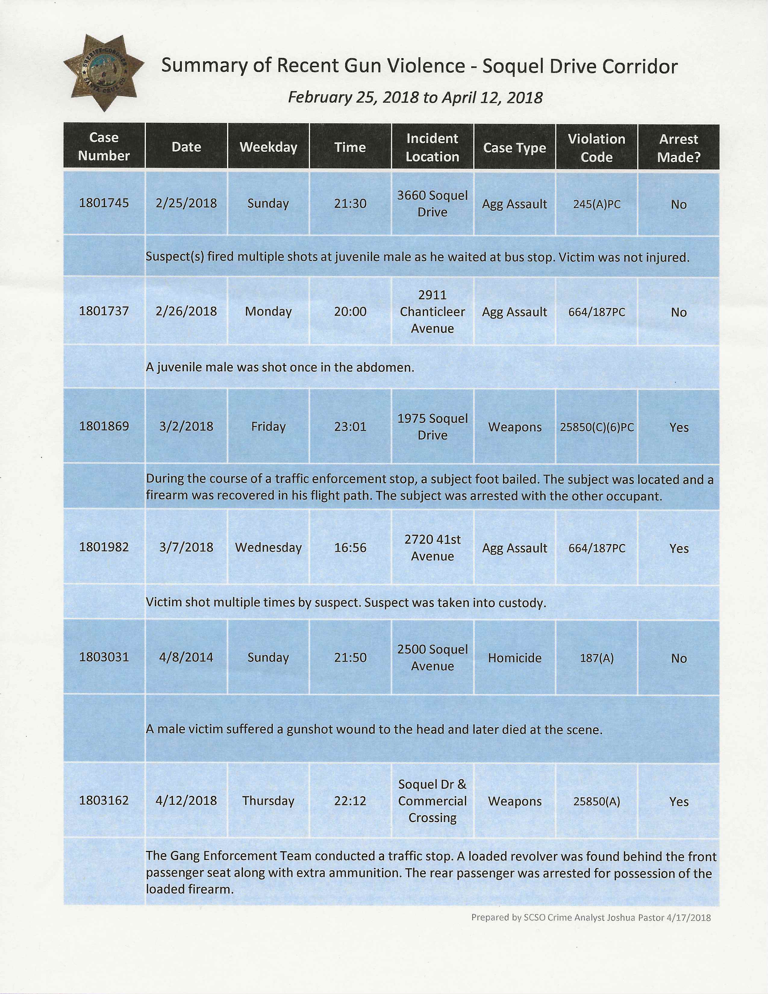 ]All this brought on by a rash of gun involved shootings, and a homicide at the Emerald Bay Apartments on Sunday 4-8-2018. Ivan Villalobos, a 26-year-old husband and father, was shot and killed on the steps just outside of the apartments office while eating nachos. Mr. Villalobos was the first homicide in the Santa Cruz County. Though the shooting may be gang related, Mr. Villalobos was not a gang member!