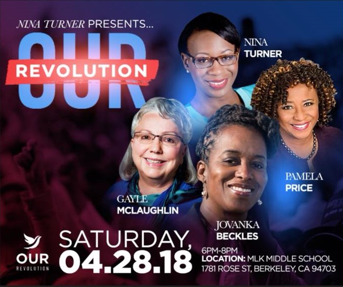 Remember that chant “Bernie, Bernie, Bernie? There’s a new one now: “Nina, Nina, Nina”! Nina Turner, President of Our Revolution, is coming to the East Bay to help us send to Sacramento and the Alameda County DA seat three corporate-free, people-powered women: