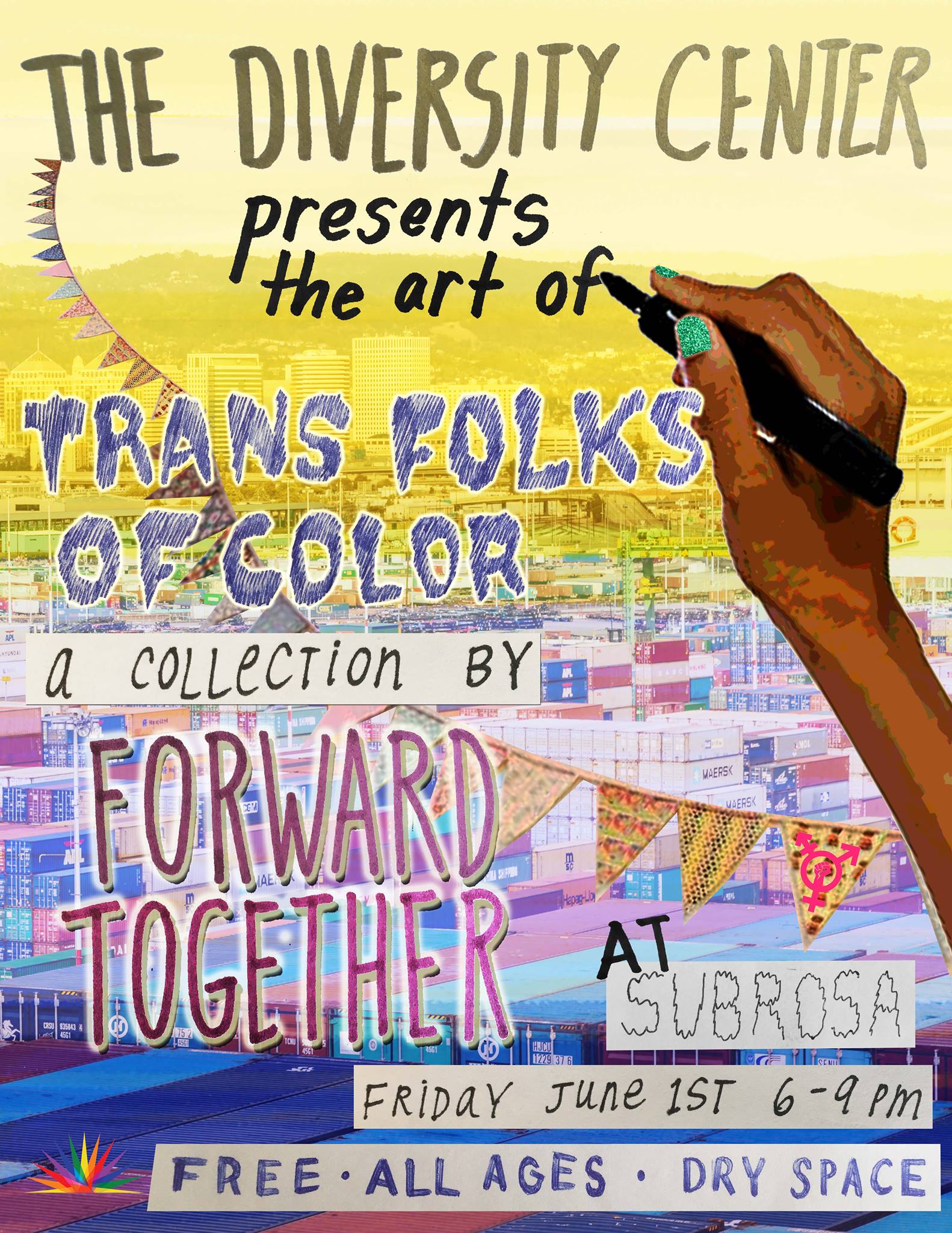 Forward Together is a nationwide organization that "focus(es) on changing the ground on which we fight for the rights, recognition and resources for all families and people." Part of their mission is to gather and promote artwork that challenges the status quo of power, and the collection they have put together for this show consists of artwork from Oakland based trans folks of color. It is a beautiful, daring, radically loving body of work to see! Come join us in celebrating the power of trans artists of color, to shake the foundations of injustice and to create something new.