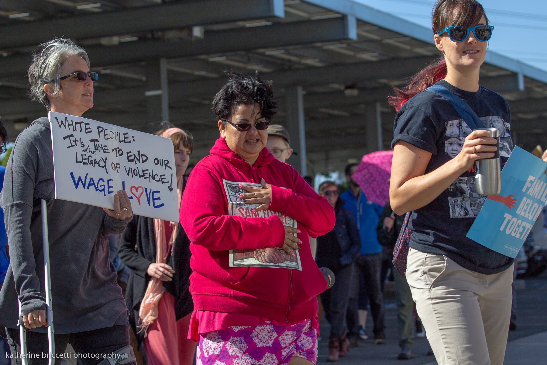 One protester led chants through a bullhorn and led the charge as demonstrators marched in front of the detention center. She commented that today’s demonstration was the gathering of many organizations and people committed to keeping up the pressure against a government making increasingly concerning decisions.