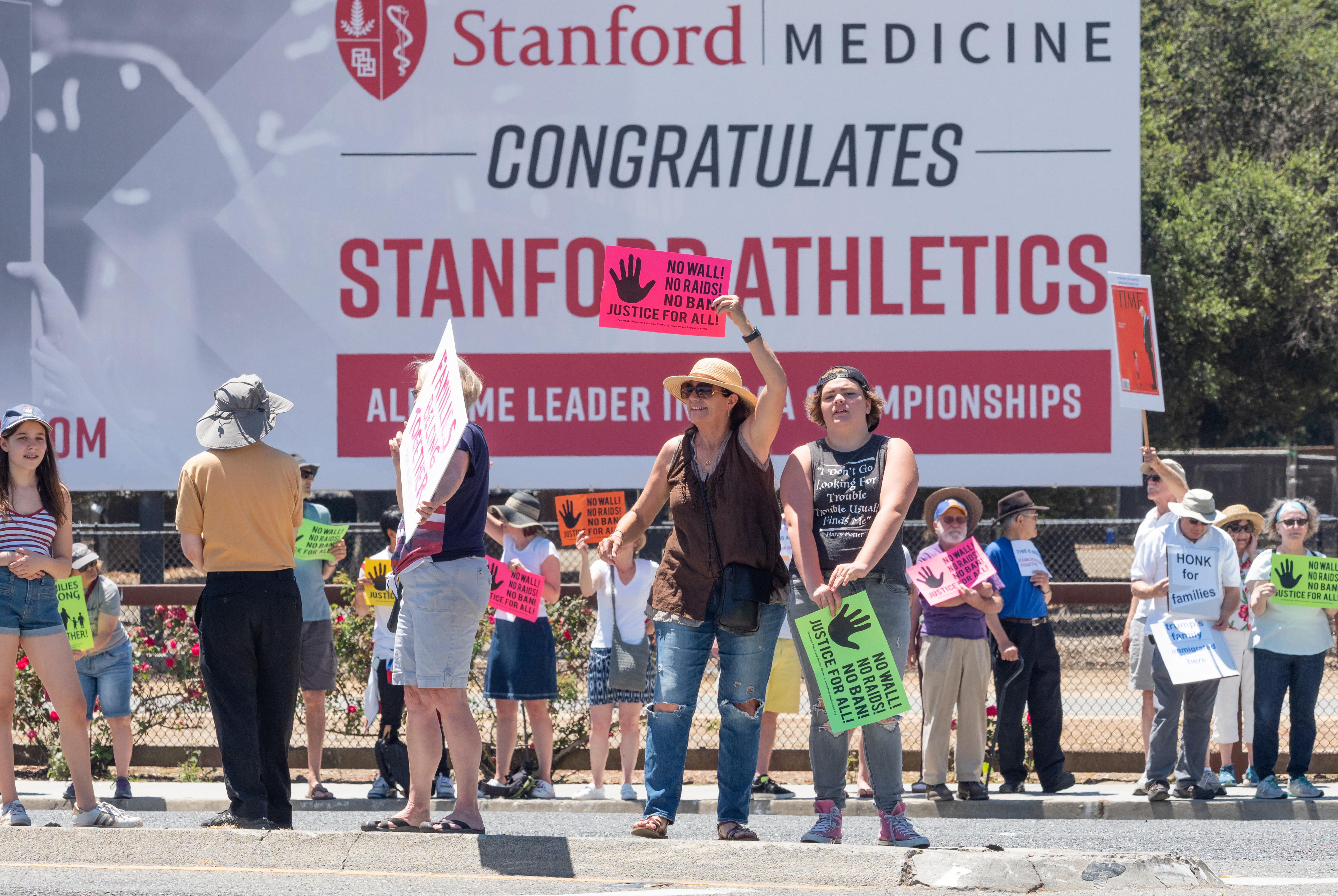 On June 30th, as part of a national day of action to protest Trump's family separations at the US/Mexico border, the Peninsula Peace and Justice Center held a rally near the entrance to Stanford University.