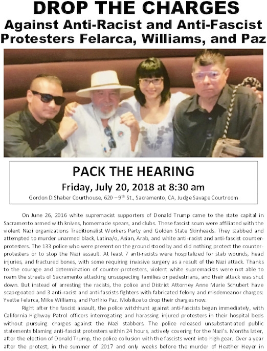Come out to support those who, out of love for their community, stood up against hate. Every hearing, more supporters have come out and filled the courtroom, spilling out into the hallway. It's made a big difference, and shows the judges and the DA that they will be held accountable by a movement will have each other's back. Support Yvette, Mike, and Porfirio, and all who make clear that Donald Trump and his movement of racism and immigrant bashing are not welcome in Sacramento or anywhere. Defeat Trump and the growth of fascism by defending anti-racist and civil rights protesters and their fight to drop these charges now.