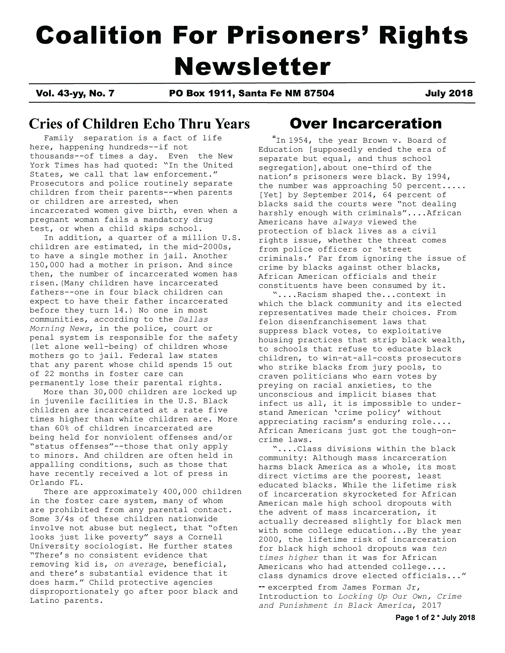 This is the July issue of the Coalition for Prisoners' Rights Newsletter (P.O. Box 1911 Santa Fe, New Mexico 87504-1911). This issue features the article "Cries of Children Echo Thru Years" and more