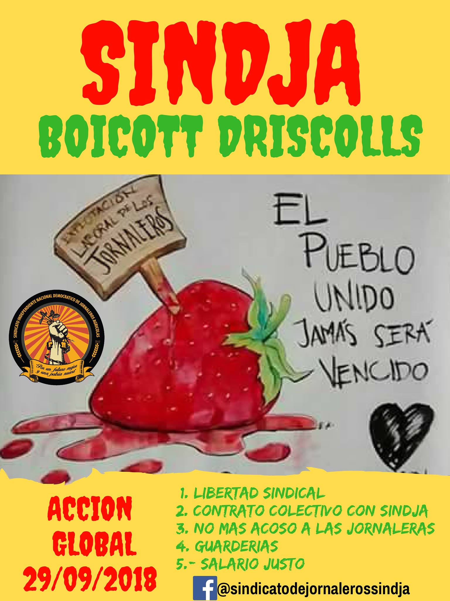 El Sindicato Independiente Nacional Democrático de Jornaleros Agrícolas, convoca a todas las organizaciones hermanas a sumarse a la Acción Global Internacional en contra de Driscoll's.
