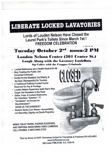 City Council allegedly has ultimately authority over the bathrooms through City Manager Martin Bernal, the powerful City Manager. or give a call to HUFF (Homeless United for Friendship & Freedom--a member of the Conscience and Action coalition) at 831-423-4833.
